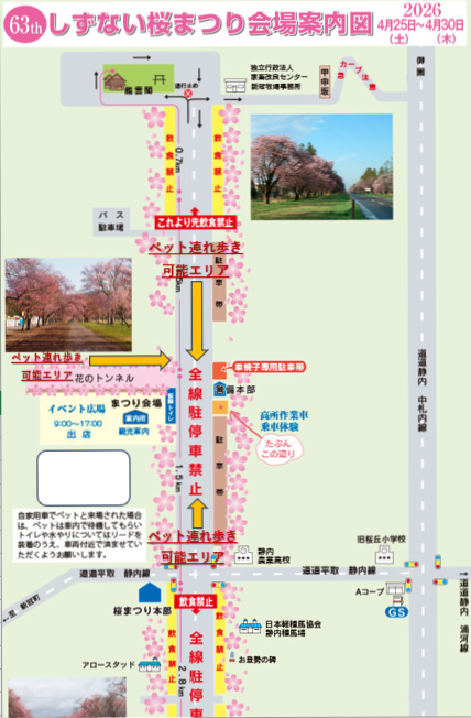 🌸第63回しずない桜まつり会場🐶ペット連れ歩き可能エリアご案内(※可能エリア以外は禁止となります) 2026 4/14 下記、会場図「静内農業高校交差点」より「バスP駐車場区間」ならびに「イベント広場(花のトンネル)」のみ🐶ペット連れ歩き可能エリアとなりますので、くれぐれも皆様のご理解・ご協力いただきお楽しみくださいますようお願い申し上げます 未分類 🌸第63回しずない桜まつり 関連記事 🌸第63回しずない桜まつり 2026年4月14日 BBQデッキを改装しました♪ 2025年11月29日 牧草ロールフォトグラフ開催 2025年9月20日 わんぞうの前でイベント開催🐶 2025年9月20日 町内の動物病院案内🐶 2025年5月24日 今日も良い天気に恵まれ絶景です🐶 2024年5月25日 2024年わんぞう♪ 2024年2月3日 昨日に引き続き、今日も秋晴れ♪ 2023年9月24日